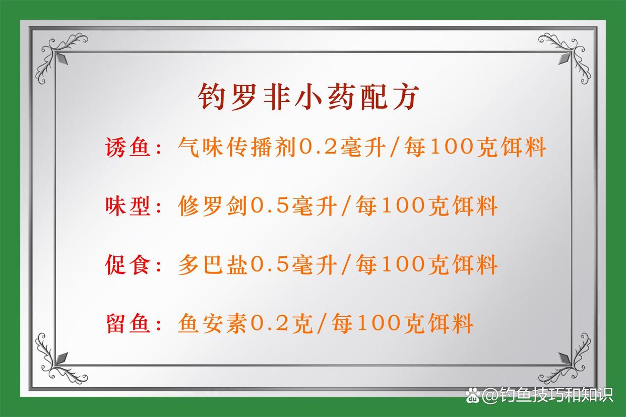 综上所述,就是深秋时钓罗非鱼的4个饵料配方。为了提高鱼饵的诱食效果,可以在开饵时添加少量的钓鱼小药,例如,每100克鱼饵, 添加0.2毫升的气味传播剂、修罗剑0.5毫升、馥郁香多巴盐0.5毫升、鱼安素0.2克。可以参考下图配方,出自鱼类实验室,效果显著。