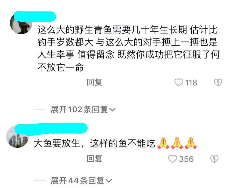 有的人感念“野生青鱼估计要几十年才能长这么大,可能比钓鱼人年纪都大”,因此希望钓鱼人放它一条生路,还有的人直言“大鱼咬放生,这样的鱼不能吃”等等......