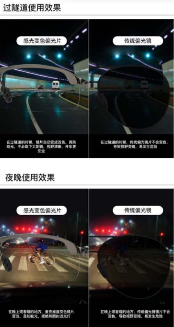这款黑科技偏光镜的特效就是有效地排除和滤除光束中的散射光线。使光线能于正轨之透光轴投入眼睛视觉影像,通俗的讲偏光镜可以把所有的光整理成同方向,使视野清晰自然。同时还能阻挡紫外光,减少光线对眼睛的伤害,清除炫目光线。