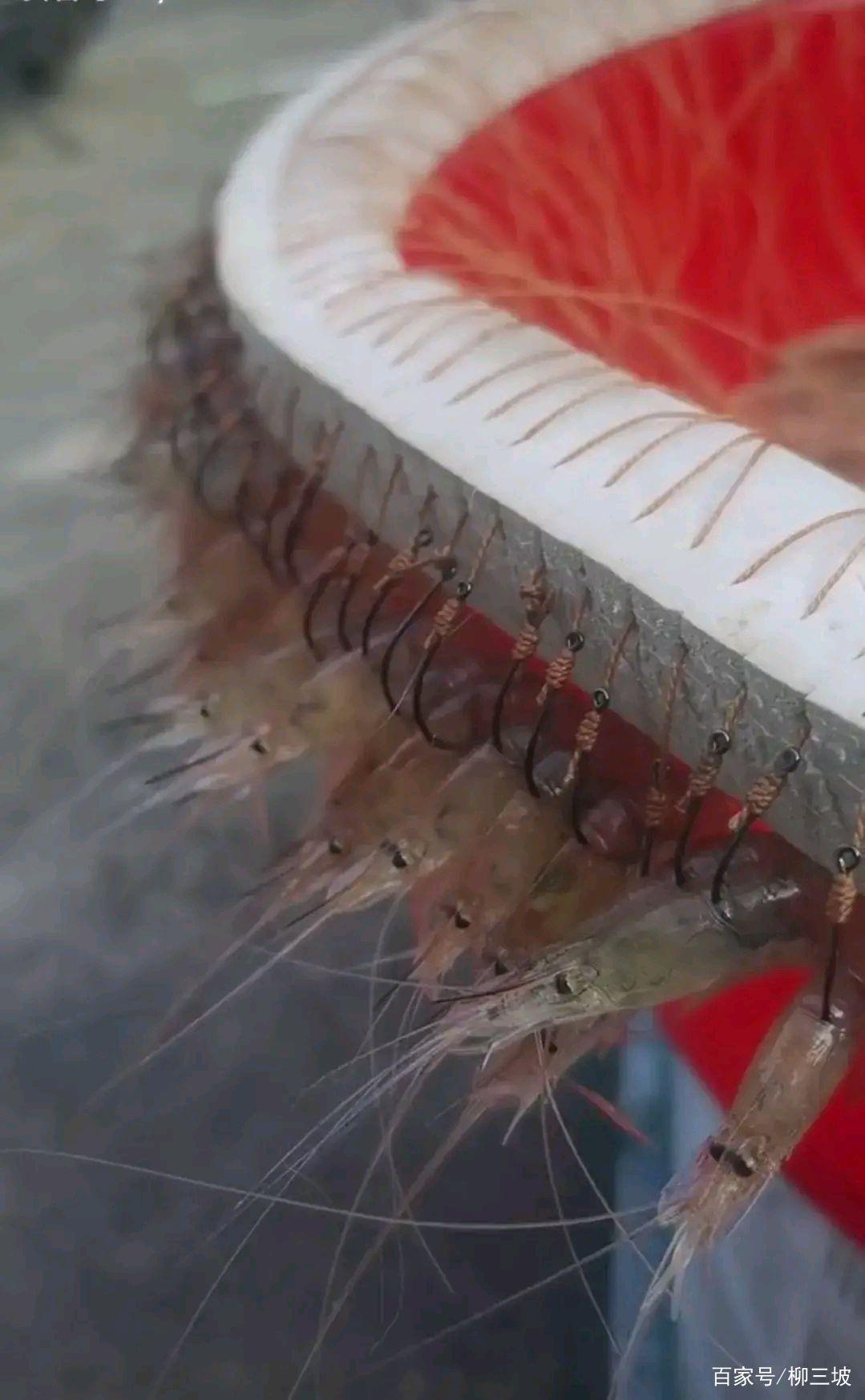 这个白色的圆形钓具直径差不多有三四十CM,圆圈的四周密密麻麻均匀地排列着起码有150个左右的鱼钩,最令人惊讶的是,那些鱼钩上的鱼饵竟然是活着的透明小虾。
